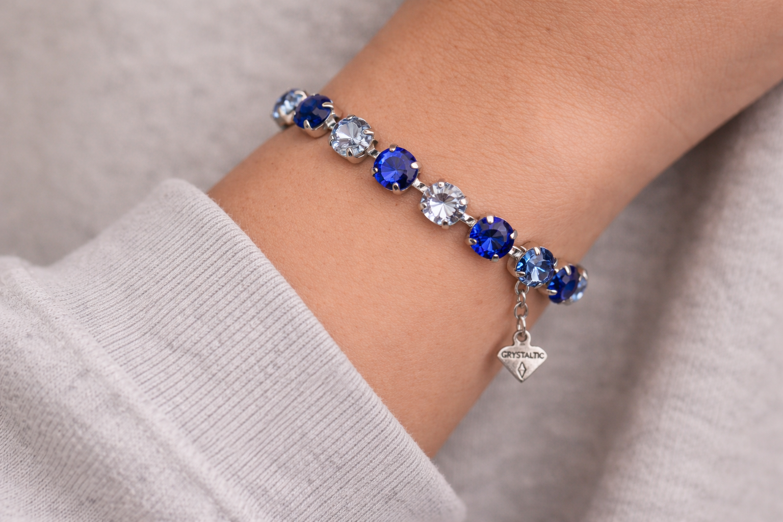 Model wears Royal Blues Crystal Tennis Bracelet in Silver (8mm).