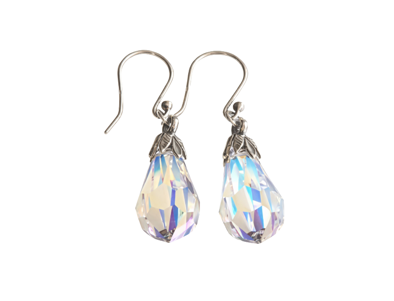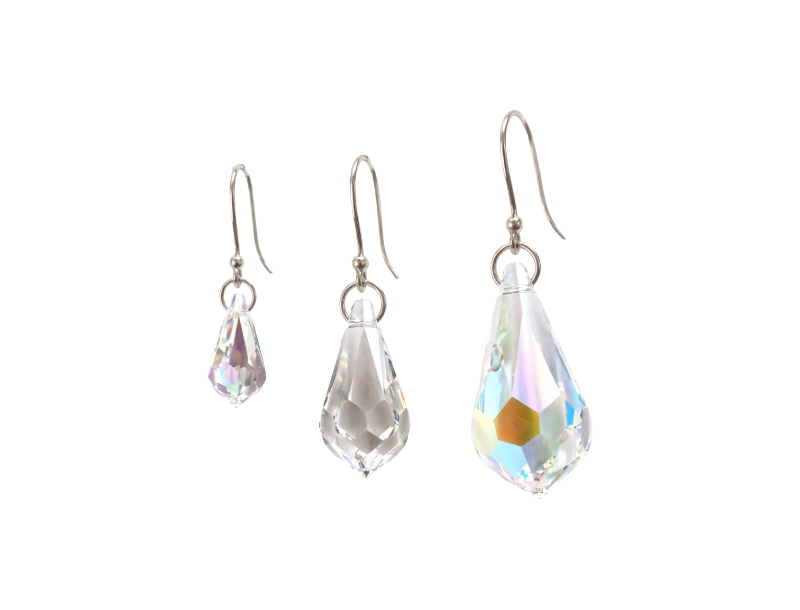 The Teardrop Aurora Borealis Crystal Earrings are available in three sizes. Small (13 x 6.5 mm), medium (22 x 11 mm), and large (28 x 14 mm). Offering a timeless yet modern look. All sizes are set entirely on sterling silver, with optional gold finishes or lever-back ear wires for added security, plus clip conversions available. Choose from Swarovski® Crystal Clear or Crystal Aurora Borealis, and pair with a matching pendant in a larger size for a complete, elevated set.